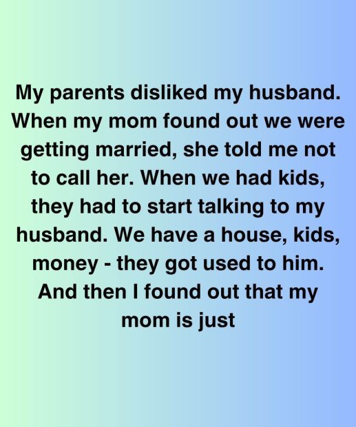 My parents disliked my husband. When my mom found out we were getting married, she told me not to call her. When we had kids, they had to start talking to my husband. We have a house, kids, money—they got used to him.