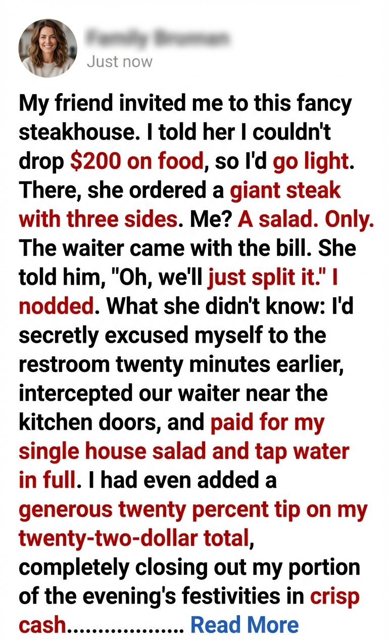 My friend invited me to this fancy steakhouse. I told her I couldn’t drop $200 on food, so I’d go light. There, she ordered a giant steak with three sides. Me? A salad. Only. The waiter came with the bill. She told him, “Oh, we’ll just split it.” I nodded. What she didn’t know: I’d secretly excused myself to the restroom twenty minutes earlier, intercepted our waiter near the kitchen doors, and paid for my single house salad and tap water in full. I had even added a generous twenty percent tip on my twenty-two-dollar total, completely closing out my portion of the evening’s festivities in crisp cash. The black, leather-bound checkbook currently resting on the pristine white tablecloth didn’t contain our combined total. It contained hers, and hers alone.