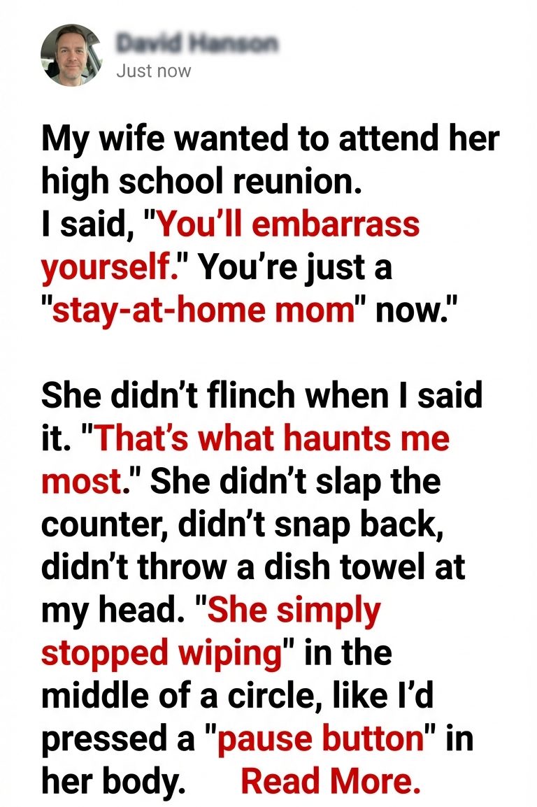 “I didn’t go,” she said, voice still level, “because I believed you. For a second, I believed you were right. I looked in the mirror and saw what you saw: a woman with a minivan, a messy bun, and no ‘impressive’ answer to that question people ask at reunions—What do you do?”
