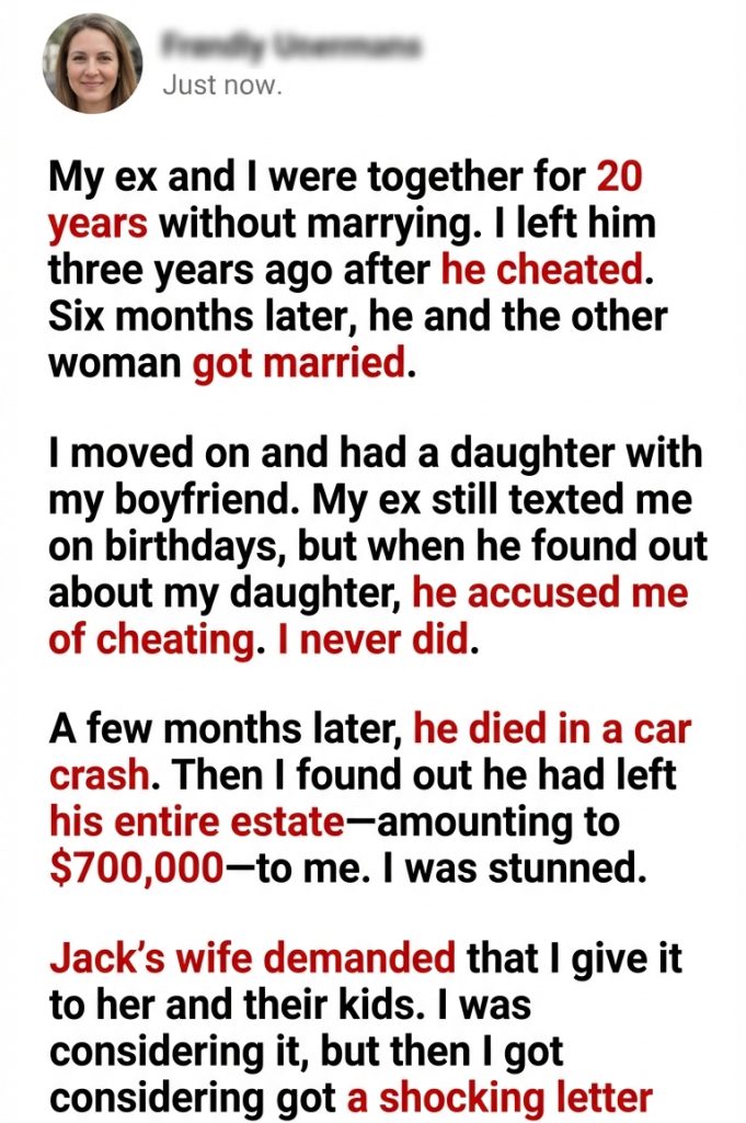 A few months later, he died in a car crash. Then I found out he had left his entire estate—amounting to $700,000—to me. I was stunned.
