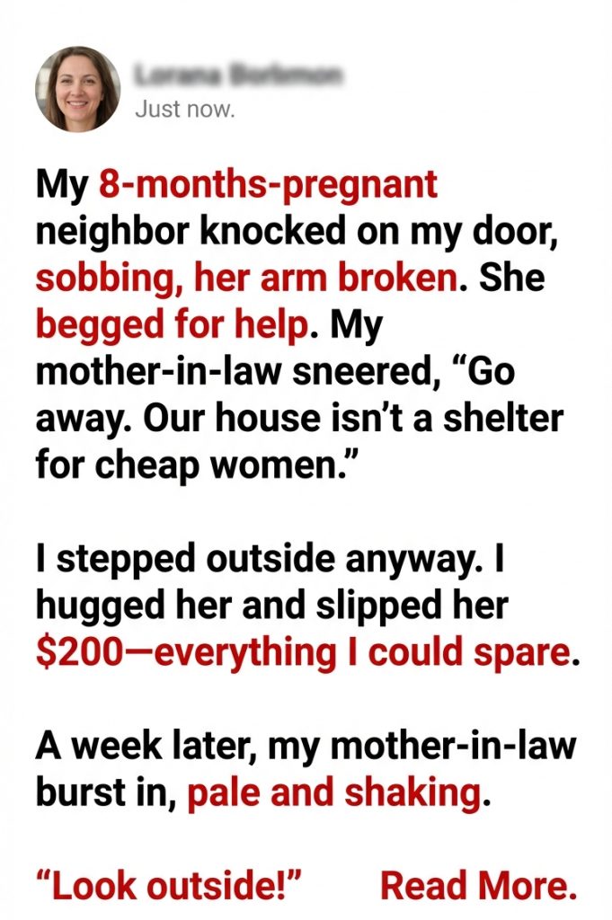 My 8-months-pregnant neighbor knocked on my door, sobbing, her arm broken. She begged for help. My mother-in-law sneered, “Go away. Our house isn’t a shelter for cheap women.”
