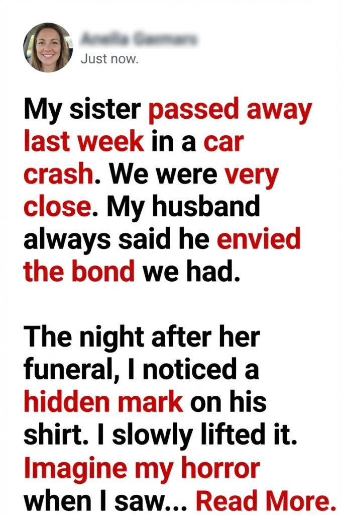 For a moment, I couldn’t breathe. My sister was dead. We had just buried her. My hands still smelled faintly like funeral flowers and hand sanitizer, and I was staring at evidence of betrayal on my husband’s clothing.