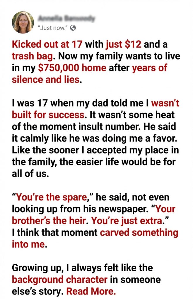 Kicked out at 17 with just $12 and a trash bag. Now my family wants to live in my $750,000 home after years of silence and lies.