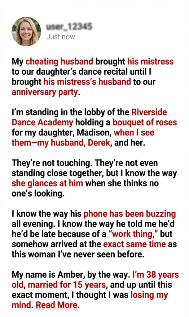 My cheating husband brought his mistress to our daughter’s dance recital until I brought his mistress’s husband to our anniversary party.