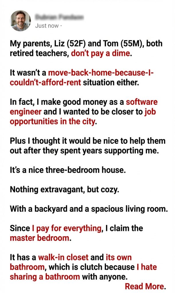 My parents started living in my house, and when my older sister also moved in, she asked for the master bedroom and half of the house’s personal space.
