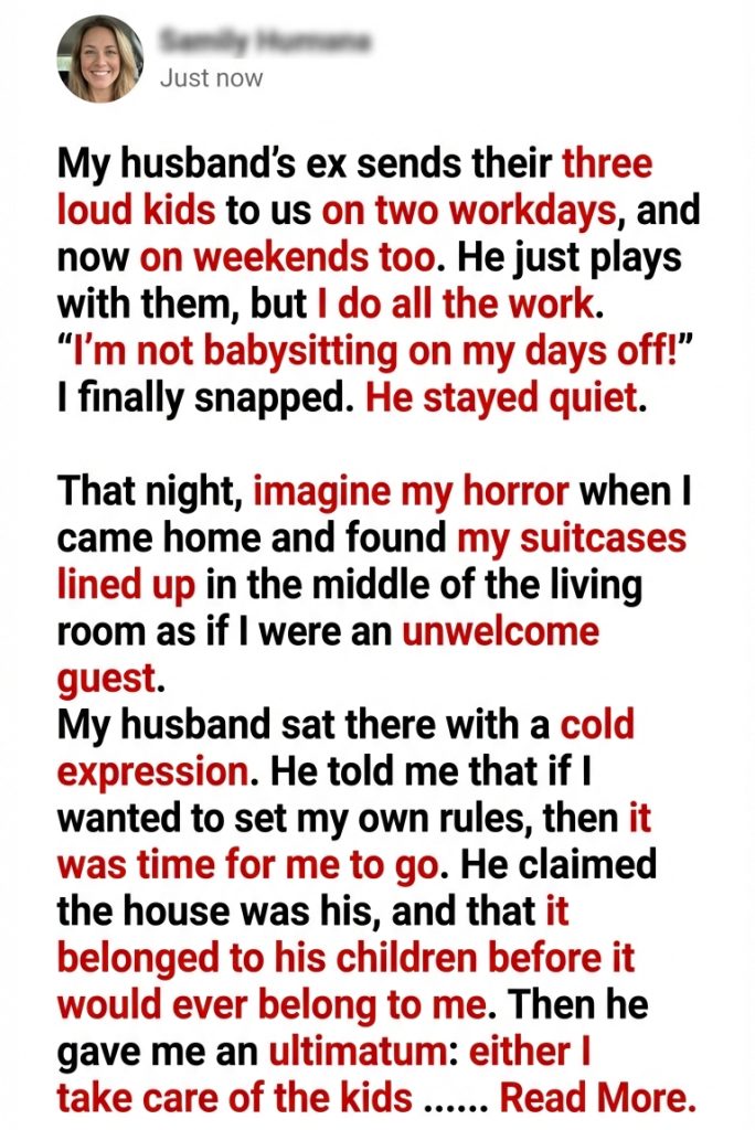That night, imagine my horror when I came home and found my suitcases lined up in the middle of the living room as if I were an unwelcome guest. My husband sat there with a cold expression. He told me that if I wanted to set my own rules, then it was time for me to go. He claimed the house was his, and that it belonged to his children before it would ever belong to me.