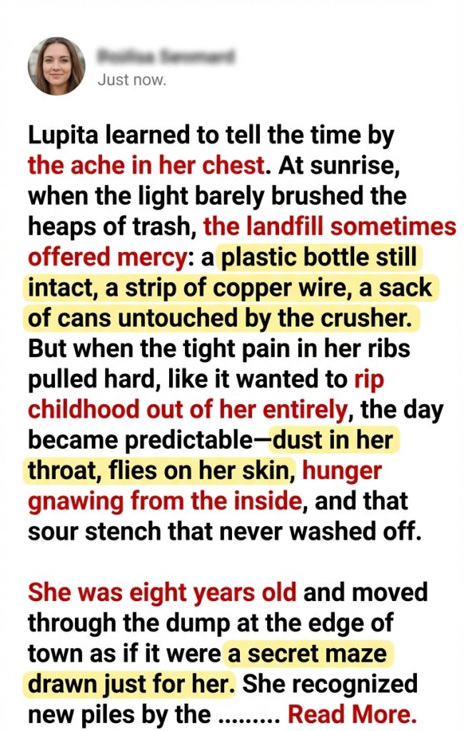 Lupita learned to tell the time by the ache in her chest. At sunrise, when the light barely brushed the heaps of trash, the landfill sometimes offered mercy: a plastic bottle still intact, a strip of copper wire, a sack of cans untouched by the crusher. But when the tight pain in her ribs pulled hard, like it wanted to rip childhood out of her entirely, the day became predictable—dust in her throat, flies on her skin, hunger gnawing from the inside, and that sour stench that never washed off. Hunger had a rhythm. It sharpened her senses, taught her patience, and reminded her constantly that nothing in her world was guaranteed—not food, not safety, not tomorrow.