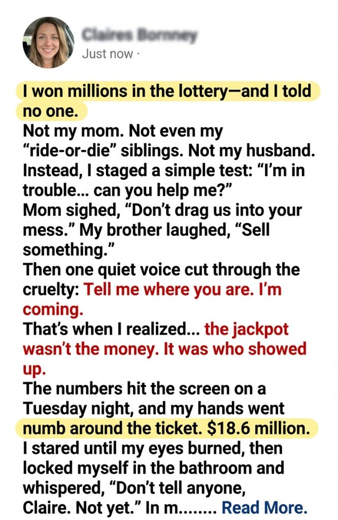 I won millions in the lottery—and I told no one. Not my mom. Not even my “ride-or-die” siblings. Not my husband. Instead, I staged a simple test: “I’m in trouble… can you help me?” Mom sighed, “Don’t drag us into your mess.” My brother laughed, “Sell something.” Then one quiet voice cut through the cruelty: “Tell me where you are. I’m coming.” That’s when I realized… the jackpot wasn’t the money. It was who showed up.