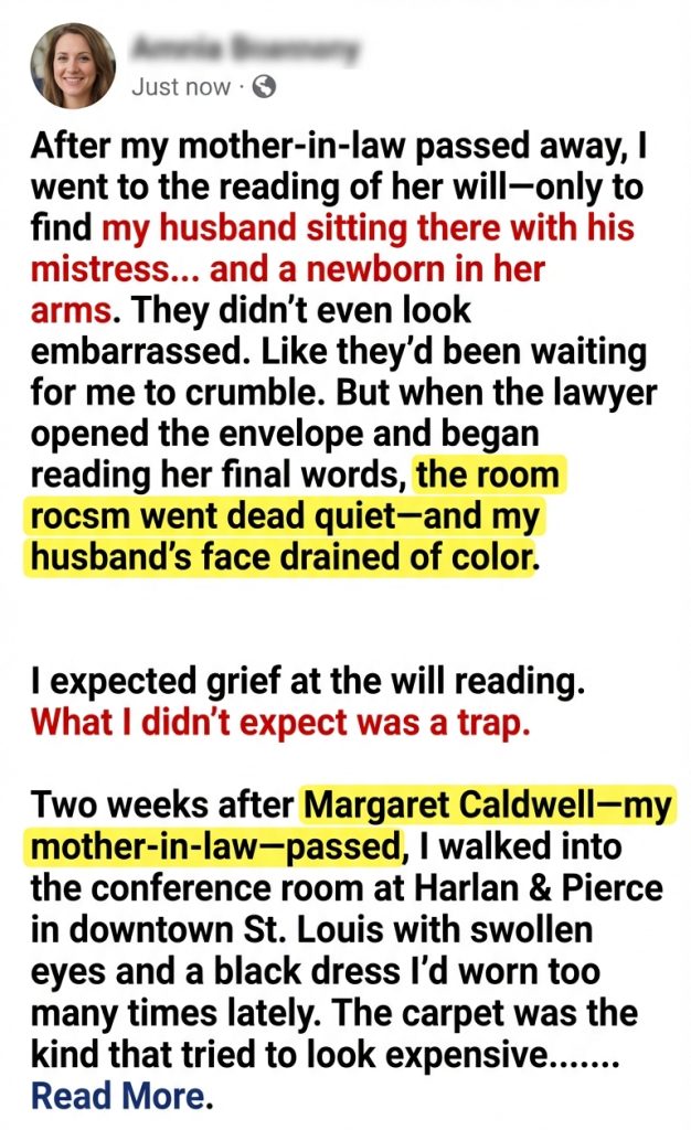 Two weeks after Margaret Caldwell—my mother-in-law—passed, I walked into the conference room at Harlan & Pierce in downtown St. Louis with swollen eyes and a black dress I’d worn too many times lately. The carpet was the kind that tried to look expensive and still smelled like old coffee. A framed print of the Gateway Arch hung crooked behind the head of the table.