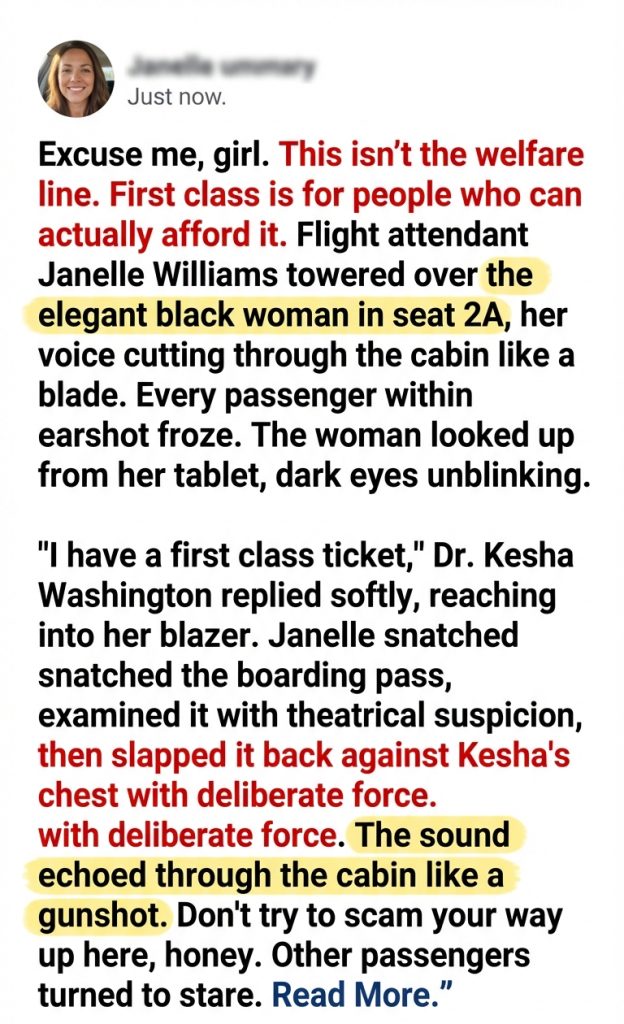 “”I have a first class ticket,”” Dr. Kesha Washington replied softly, reaching into her blazer. Janelle snatched the boarding pass, examined it with theatrical suspicion, then slapped it back against Kesha’s chest with deliberate force. The sound echoed through the cabin like a gunshot. Don’t try to scam your way up here, honey. Other passengers turned to stare.