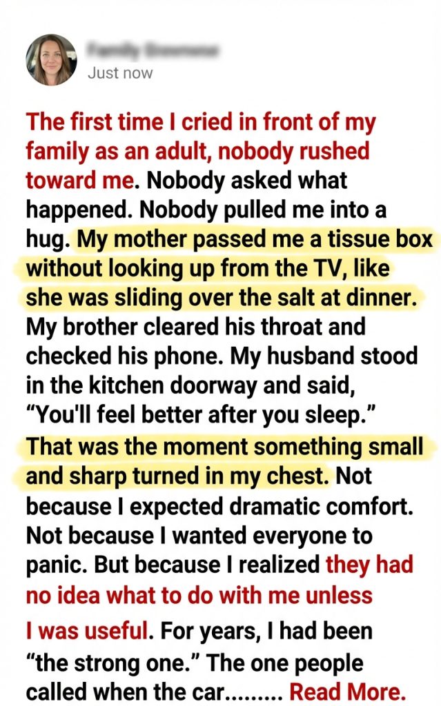 Nobody asked what happened. Nobody pulled me into a hug. My mother passed me a tissue box without looking up from the TV, like she was sliding over the salt at dinner. My brother cleared his throat and checked his phone. My husband stood in the kitchen doorway and said, “You’ll feel better after you sleep.”