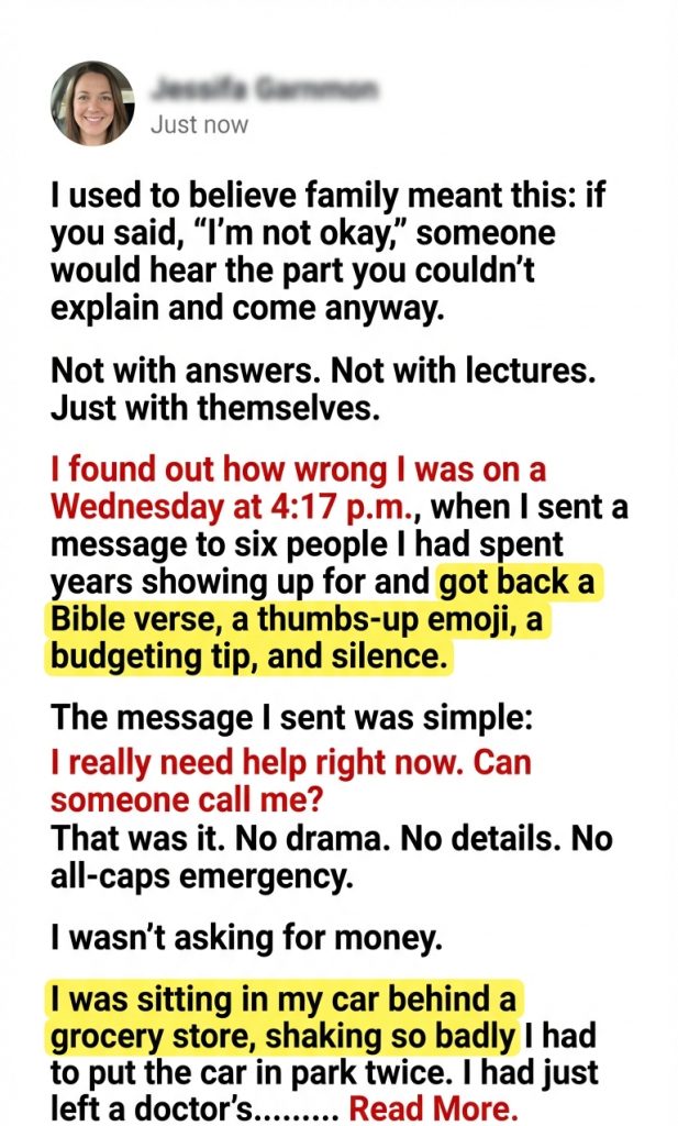 I found out how wrong I was on a Wednesday at 4:17 p.m., when I sent a message to six people I had spent years showing up for and got back a Bible verse, a thumbs-up emoji, a budgeting tip, and silence.