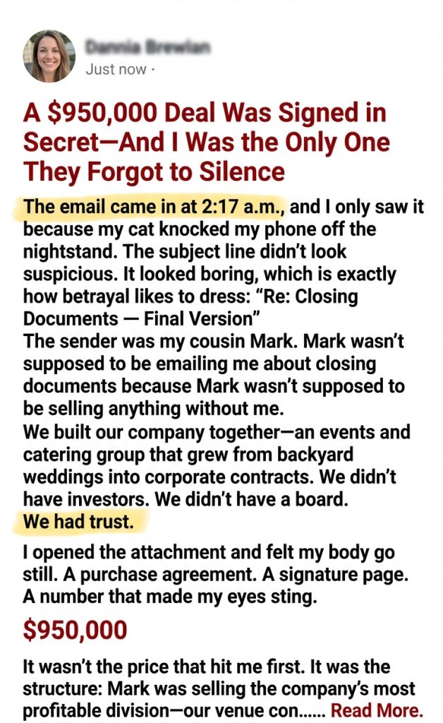 Mark wasn’t supposed to be emailing me about closing documents because Mark wasn’t supposed to be selling anything without me. We built our company together—an events and catering group that grew from backyard weddings into corporate contracts. We didn’t have investors. We didn’t have a board.