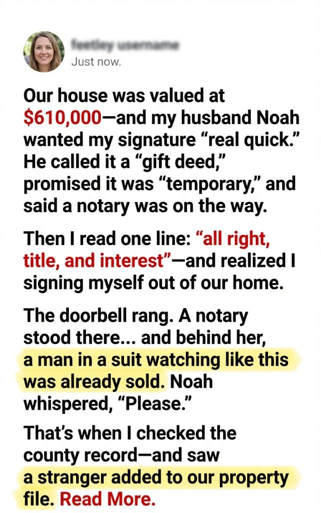 He slid it closer. “It’s for the house. The bank said we can lock a better rate if we clean up the title. It’s basically a gift deed. Super normal.”
