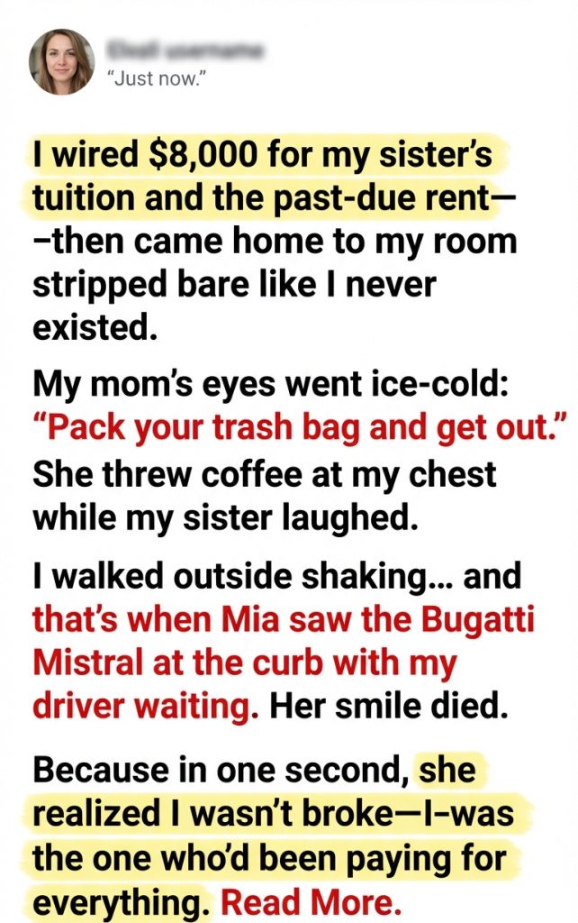 My name is Lauren Parker, and the day my mother kicked me out started like any other exhausted Monday—one of those days where you’re so tired you can’t tell if you’re hungry or just hollow. I’d just wired the last of my savings—eight thousand dollars—to cover my little sister Mia’s community college tuition and the past-due rent on our small two-bedroom house in Columbus, Ohio. I worked double shifts as a nurse at St. Vincent’s, slept in my car between nights, and ate whatever was left over in the hospital cafeteria. But I kept telling myself it was worth it. Mom always said family stuck together. I believed her. I believed her so hard it became a habit.