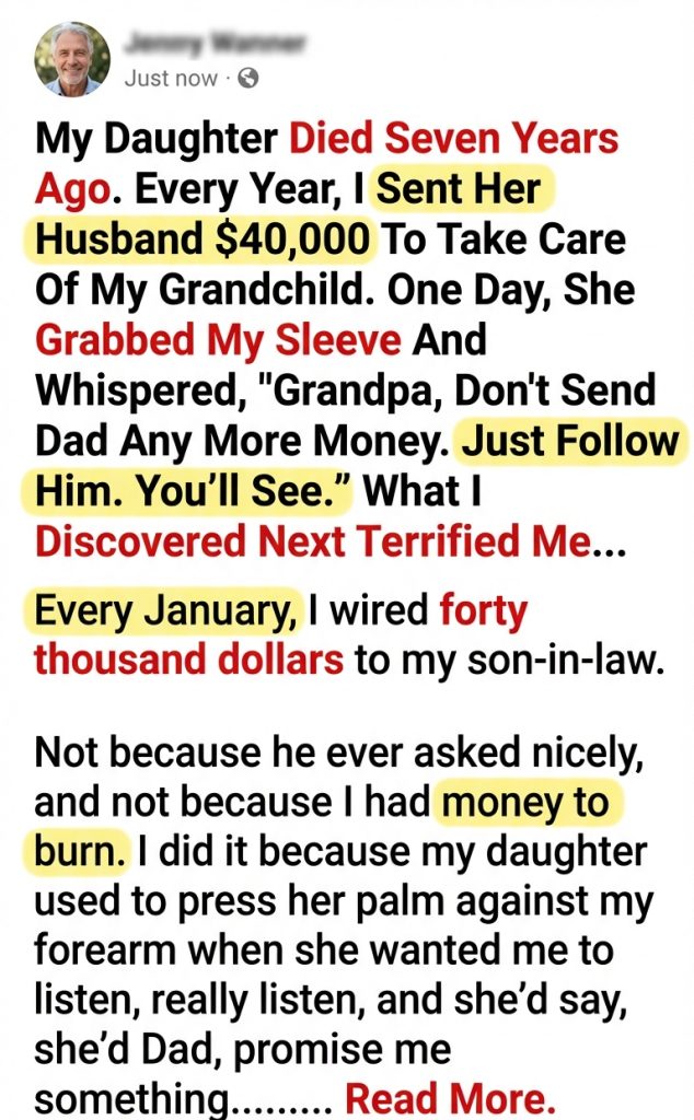 My Daughter Died Seven Years Ago. Every Year, I Sent Her Husband $40,000 To Take Care Of My Grandchild. One Day, She Grabbed My Sleeve And Whispered, “Grandpa, Don’t Send Dad Any More Money. Just Follow Him. You’ll See.” What I Discovered Next Terrified Me…