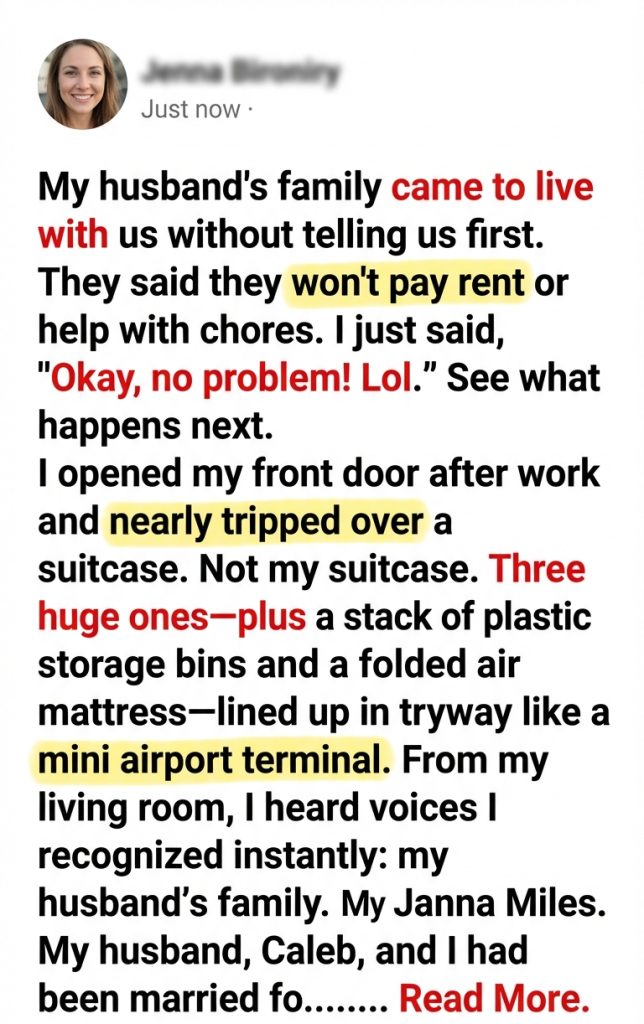 My husband’s family came to live with us without telling us first. They said they won’t pay rent or help with chores. I just said, “”Okay, no problem! Lol.”” See what happens next.