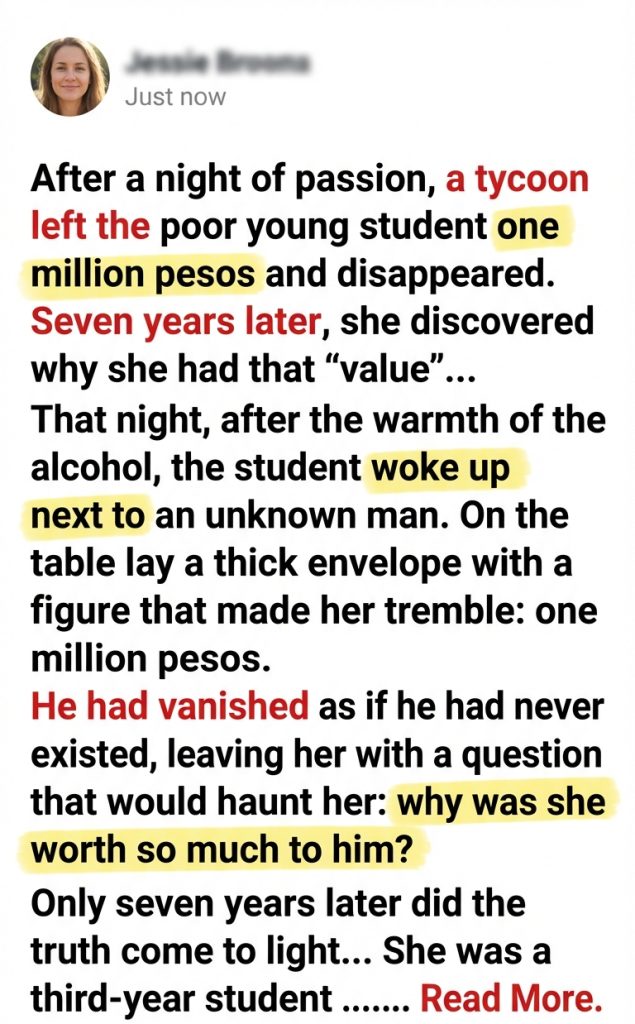 That night, after the warmth of the alcohol, the student woke up next to an unknown man. On the table lay a thick envelope with a figure that made her tremble: one million pesos. He had vanished as if he had never existed, leaving her with a question that would haunt her: why was she worth so much to him? Only seven years later did the truth come to light…
