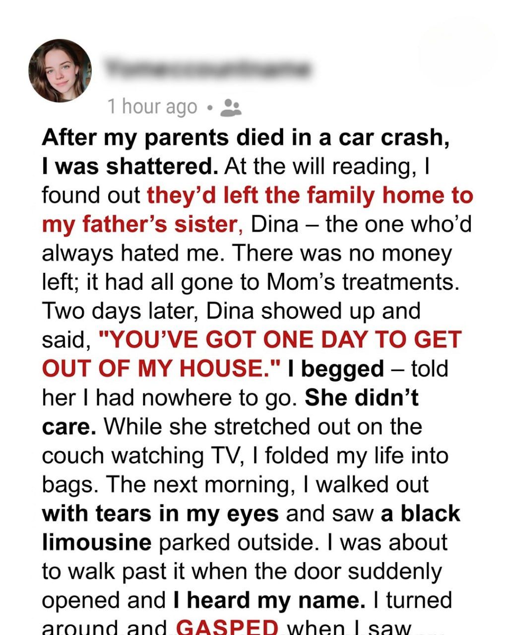 I looked at the house one last time. It wasn’t just my home I’d lost. It was my identity. My family. My entire past. And the black limo, sleek and unforgiving, was the final, devastating witness to the crumbling ruins of my life.