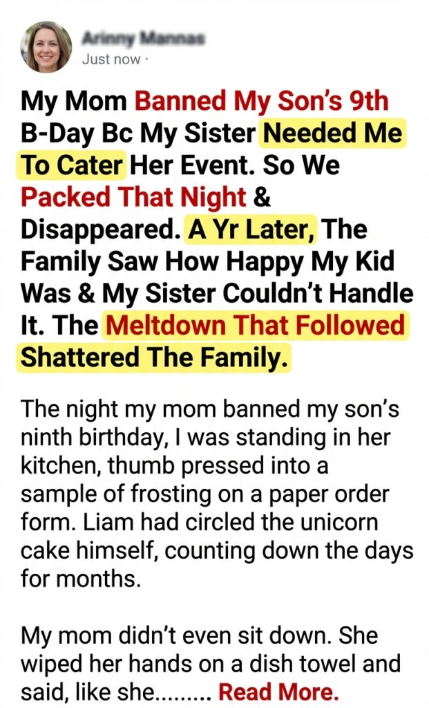 The night my mom banned my son’s ninth birthday, I was standing in her kitchen, thumb pressed into a sample of frosting on a paper order form. Liam had circled the unicorn cake himself, counting down the days for months.