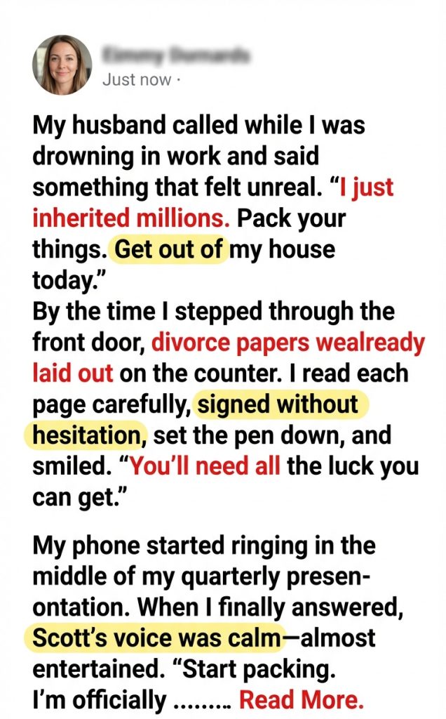 My husband called while I was drowning in work and said something that felt unreal. “I just inherited millions. Pack your things. Get out of my house today.” By the time I stepped through the front door, divorce papers were already laid out on the counter. I read each page carefully, signed without hesitation, set the pen down, and smiled. “You’ll need all the luck you can get.”