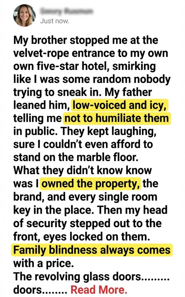 My brother stopped me at the velvet-rope entrance to my own five-star hotel, smirking like I was some random nobody trying to sneak in. My father leaned in beside him, low-voiced and icy, telling me not to humiliate them in public. They kept laughing, sure I couldn’t even afford to stand on the marble floor. What they didn’t know was I owned the property, the brand, and every single room key in the place. Then my head of security stepped out to the front, eyes locked on them. Family blindness always comes with a price.