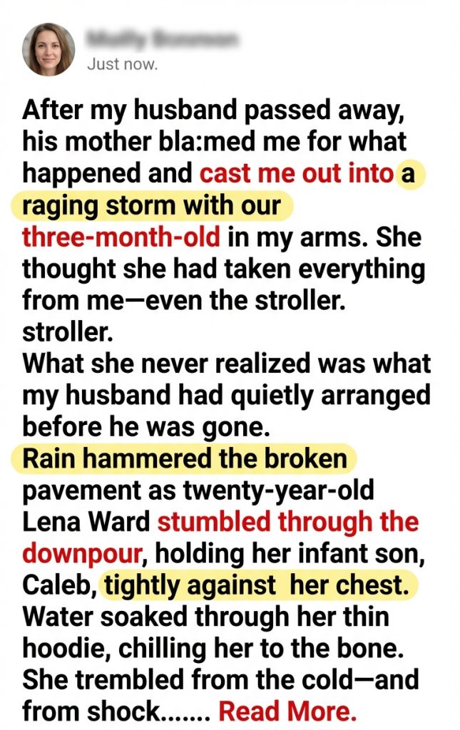 After my husband passed away, his mother blamed me for what happened and cast me out into a raging storm with our three-month-old in my arms. She thought she had taken everything from me—even the stroller. What she never realized was what my husband had quietly arranged before he was gone.