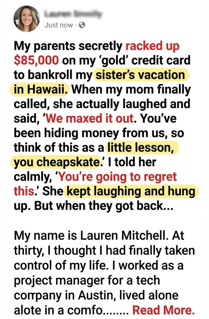 “My parents secretly racked up $85,000 on my ‘gold’ credit card to bankroll my sister’s vacation in Hawaii. When my mom finally called, she actually laughed and said, ‘We maxed it out. You’ve been hiding money from us, so think of this as a little lesson, you cheapskate.’ I told her calmly, ‘You’re going to regret this.’ She kept laughing and hung up. But when they got back…”