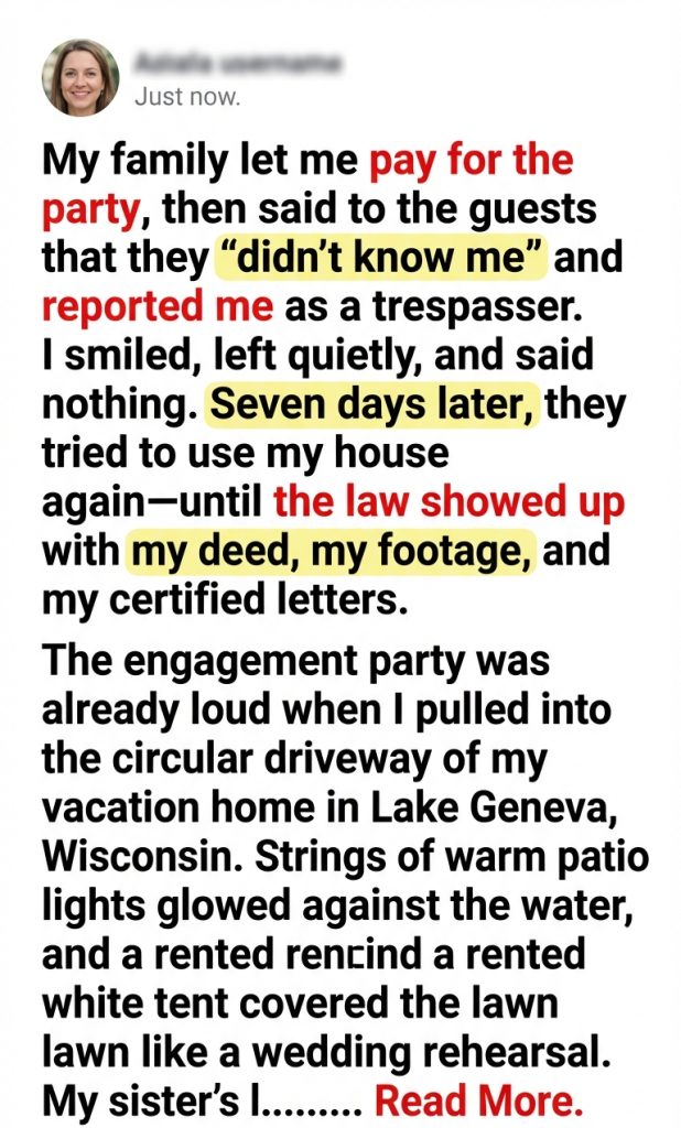 The engagement party was already loud when I pulled into the circular driveway of my vacation home in Lake Geneva, Wisconsin. Strings of warm patio lights glowed against the water, and a rented white tent covered the lawn like a wedding rehearsal. My sister’s laugh carried across the deck—high, performative, the kind she used when she wanted an audience.