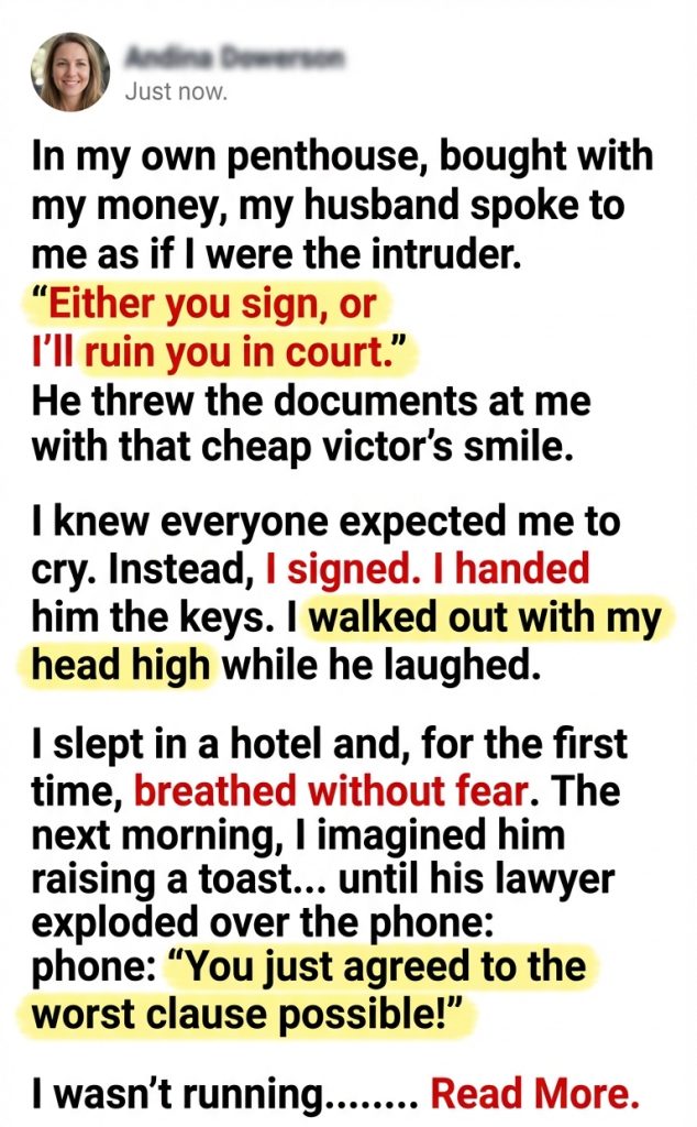 In my own penthouse, bought with my money, my husband spoke to me as if I were the intruder. “Either you sign, or I’ll ruin you in court.” He threw the documents at me with that cheap victor’s smile. I knew everyone expected me to cry. Instead, I signed. I handed him the keys. I walked out with my head high while he laughed. I slept in a hotel and, for the first time, breathed without fear. The next morning, I imagined him raising a toast… until his lawyer exploded over the phone: “You just agreed to the worst clause possible!” I wasn’t running away. I was closing a trap.
