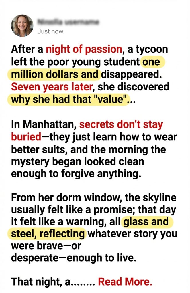 That night, after the warmth of the alcohol, the student woke up next to an unknown man. On the table lay a thick envelope with a figure that made her tremble: one million dollars. He had vanished as if he had never existed, leaving her with a question that would haunt her: why was she worth so much to him? Only seven years later did the truth come to light…