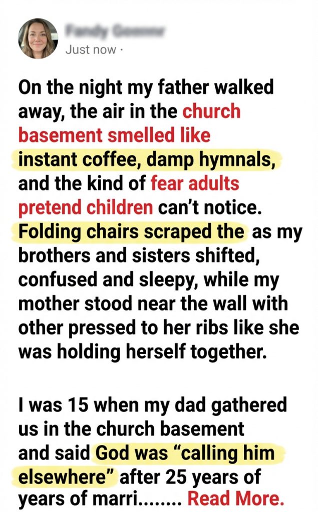 On the night my father walked away, the air in the church basement smelled like instant coffee, damp hymnals, and the kind of fear adults pretend children can’t notice. Folding chairs scraped the linoleum as my brothers and sisters shifted, confused and sleepy, while my mother stood near the wall with one hand on her belly, the other pressed to her ribs like she was holding herself together.