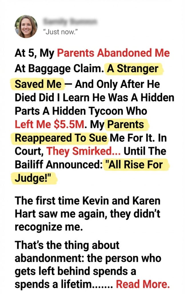 At 5, My Parents Abandoned Me At Baggage Claim. A Stranger Saved Me — And Only After He Died Did I Learn He Was A Hidden Tycoon Who Left Me $5.5M. My Parents Reappeared To Sue Me For It. In Court, They Smirked… Until The Bailiff Announced: “All Rise For Judge!”