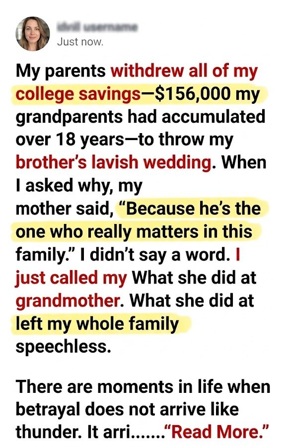 My parents withdrew all of my college savings—$156,000 my grandparents had accumulated over 18 years—to throw my brother’s lavish wedding. When I asked why, my mother said, “Because he’s the one who really matters in this family.” I didn’t say a word. I just called my grandmother. What she did at my brother’s wedding left my whole family speechless.