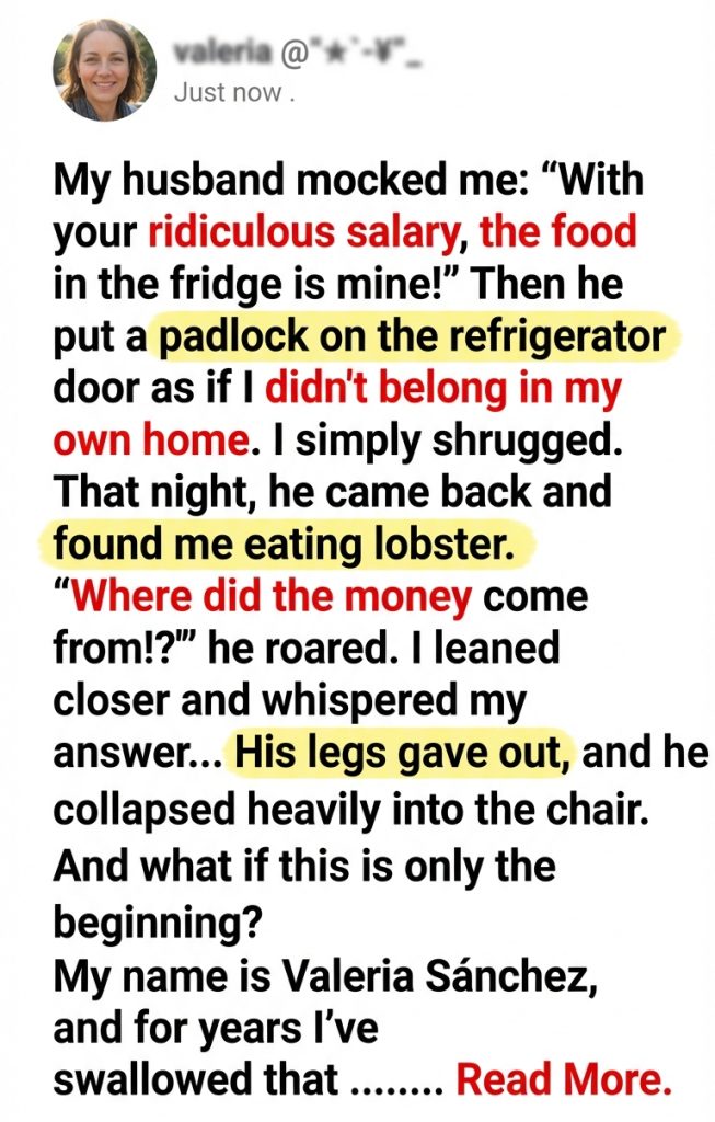My husband mocked me: “With your ridiculous salary, the food in the fridge is mine!” Then he put a padlock on the refrigerator door as if I didn’t belong in my own home. I simply shrugged. That night, he came back and found me eating lobster. “Where did the money come from!?” he roared. I leaned closer and whispered my answer… His legs gave out, and he collapsed heavily into the chair. And what if this is only the beginning?