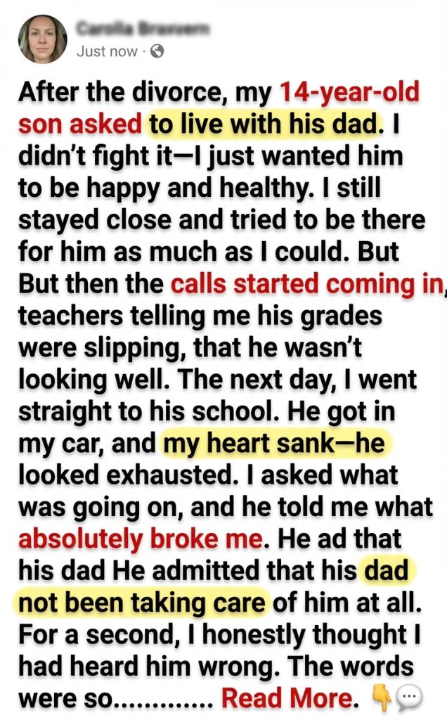After the divorce, my 14-year-old son asked to live with his dad. I didn’t fight it—I just wanted him to be happy and healthy. I still stayed close and tried to be there for him as much as I could. But then the calls started coming in, teachers telling me his grades were slipping, that he wasn’t looking well. The next day, I went straight to his school. He got in my car, and my heart sank—he looked exhausted. I asked what was going on, and he told me what absolutely broke me. He admitted that his dad…