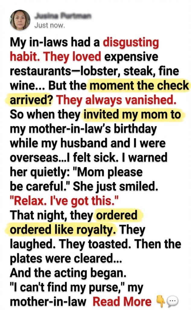 My in-laws had a disgusting habit. They loved expensive restaurants—lobster, steak, fine wine… But the moment the check arrived? They always vanished. So when they invited my mom to my mother-in-law’s birthday dinner while my husband and I were overseas…I felt sick. I warned her quietly: “Mom please be careful.” She just smiled. “Relax. I’ve got this.” That night, they ordered like royalty. They laughed. They toasted. Then the plates were cleared… And the acting began. “I can’t find my purse,” my mother-in-law gasped. “I left my wallet in the car,” my father-in-law said. “Emergency call,” my sister-in-law whispered. One by one they slipped away. Leaving my mom alone with a bill big enough to ruin her month. But my story doesn’t begin in that restaurant. It begins years earlier, with a pattern so shameless that by then, I could smell it coming before the menus even opened.
