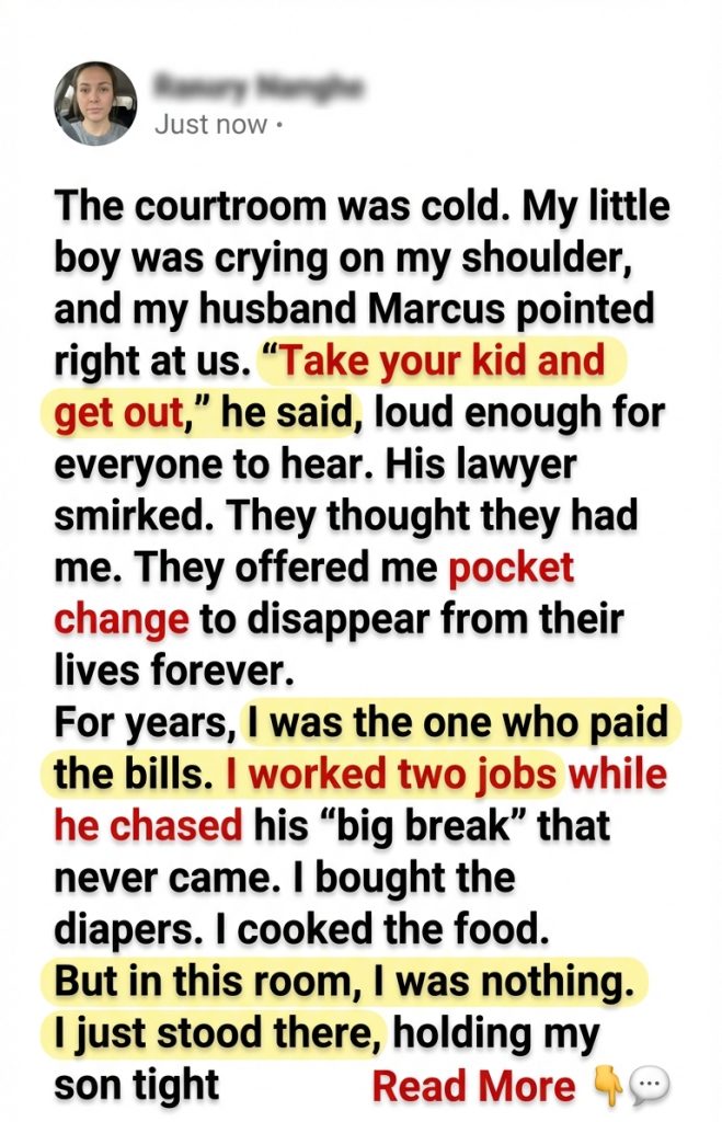 The courtroom was cold. My little boy was crying on my shoulder, and my husband Marcus pointed right at us. “Take your kid and get out,” he said, loud enough for everyone to hear. His lawyer smirked. They thought they had me. They offered me pocket change to disappear from their lives forever. For years, I was the one who paid the bills. I worked two jobs while he chased his “big break” that never came. I bought the diapers. I cooked the food. But in this room, I was nothing. I just stood there, holding my son tighter, and I didn’t say a word. I let them think they were winning. That’s when the judge stopped flipping through the papers. She leaned forward, reading one page very carefully. The whole room got quiet. She looked up from the paper, first at me, then at Marcus. Her voice was steady and calm.