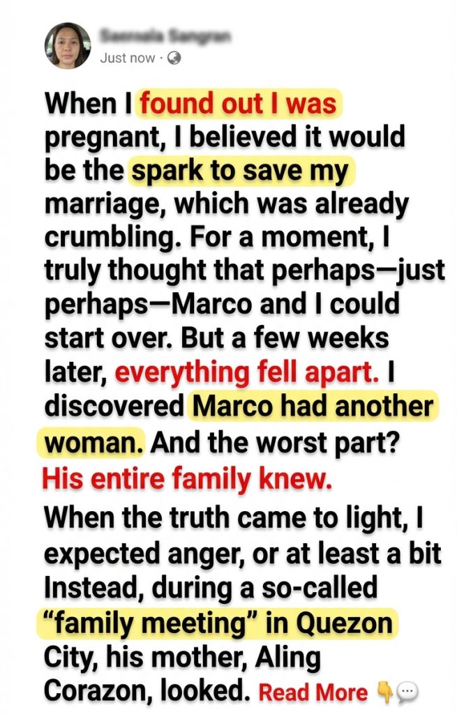 Marco’s sister busied herself with her phone. His uncle stared out the window. Aling Corazon folded her arms like she had just settled an ordinary household matter. To them, I was no longer a wife, no longer a person with feelings, fears, and dignity. I was simply a womb waiting to prove its worth.