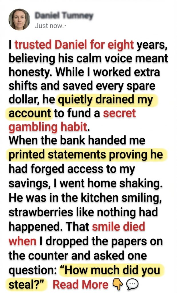 I drove home shaking so hard I had to pull over twice. When I walked into the kitchen, Daniel was standing at the counter, smiling, cutting strawberries like a man in a commercial. That image still haunts me more than the statements. Not the theft itself, but the normalcy of him. The casual joy. The confidence.