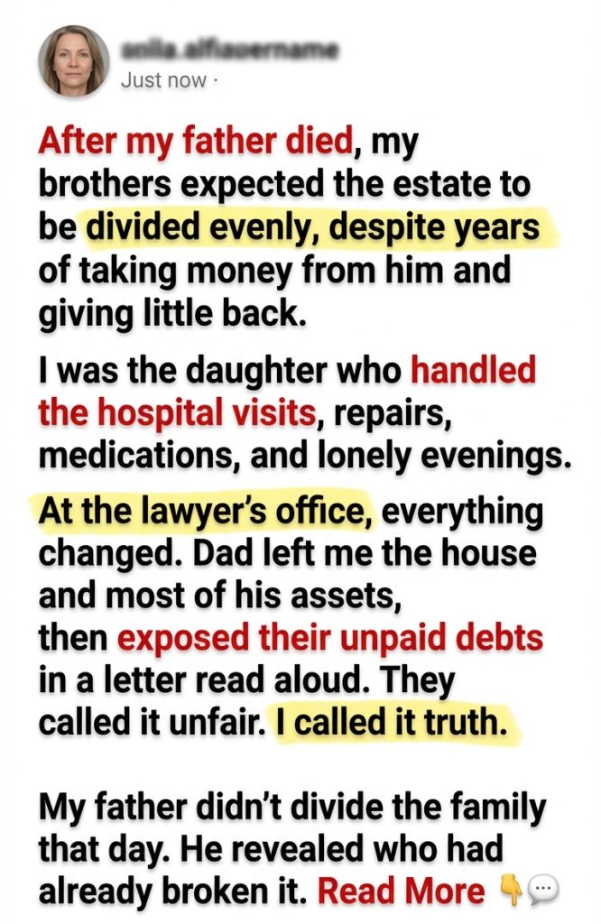 My father was the kind of man who rarely raised his voice, which meant everyone listened when he did. He believed in hard work, clear promises, and keeping your word even when it cost you. My brothers liked to say he was old-fashioned. I used to say he was dependable. After he died, I learned those are not always the same thing.