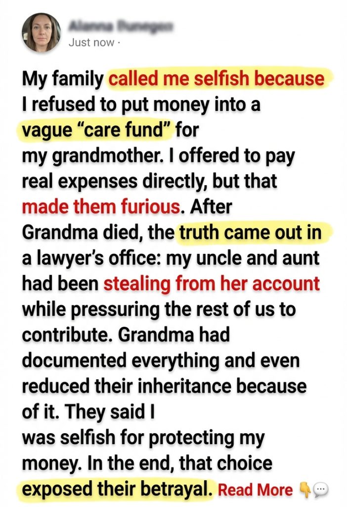 My family called me selfish because I refused to put money into a vague “care fund” for my grandmother. I offered to pay real expenses directly, but that made them furious. After Grandma died, the truth came out in a lawyer’s office: my uncle and aunt had been stealing from her account while pressuring the rest of us to contribute. Grandma had documented everything and even reduced their inheritance because of it. They said I was selfish for protecting my money. In the end, that choice exposed their betrayal.