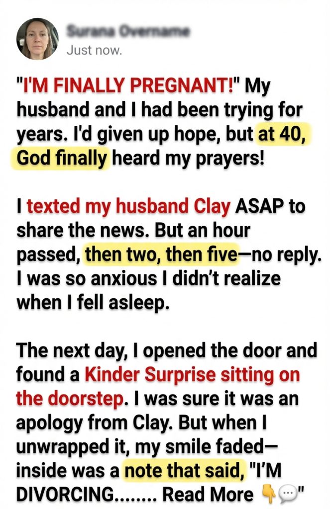 I laughed then—a broken, unbelieving laugh that tasted like panic. “With a Kinder egg? With a typed note on the doorstep? After I texted you that I’m pregnant?” My tears came harder now. “Do you hear yourself?”