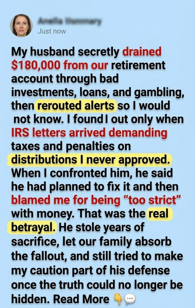 That one listed penalties. Penalties for distributions I had not authorized, on money I had worked to protect, from an account Daniel had looted while still sleeping beside me every night. The sheer administrative cruelty of it nearly broke me. Betrayal would have been enough. But the government wanted paperwork, explanations, and payment too.