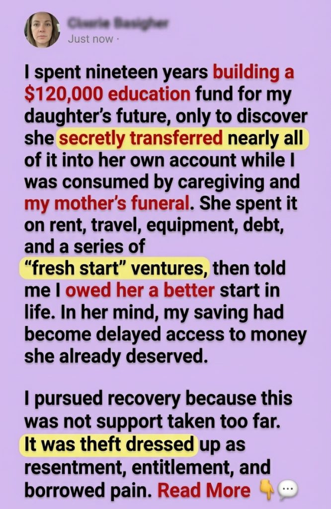 My daughter secretly took $120,000 meant for education and said I owed her a better start in life. But a better start is not something you can steal from the future without consequence. I built that money to become a bridge. She used it as a bonfire. And the worst part was not the loss itself. It was realizing she had looked at years of my care and seen only a delayed payout.