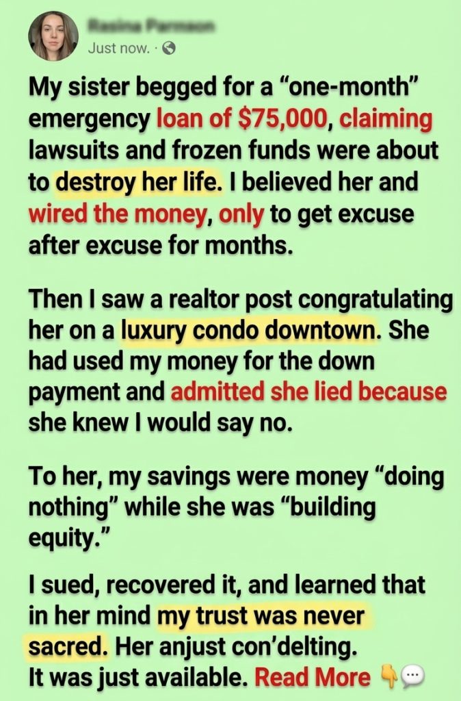 My sister borrowed $75,000 for “one month,” then used it to buy herself a luxury condo and called it stability. What she really bought was a permanent answer to a question I had spent too many years avoiding: whether she loved me as a sister or relied on me as a soft place to land while she reached for the next shining version of herself. I know the answer now. It came with a river view and a doorman.