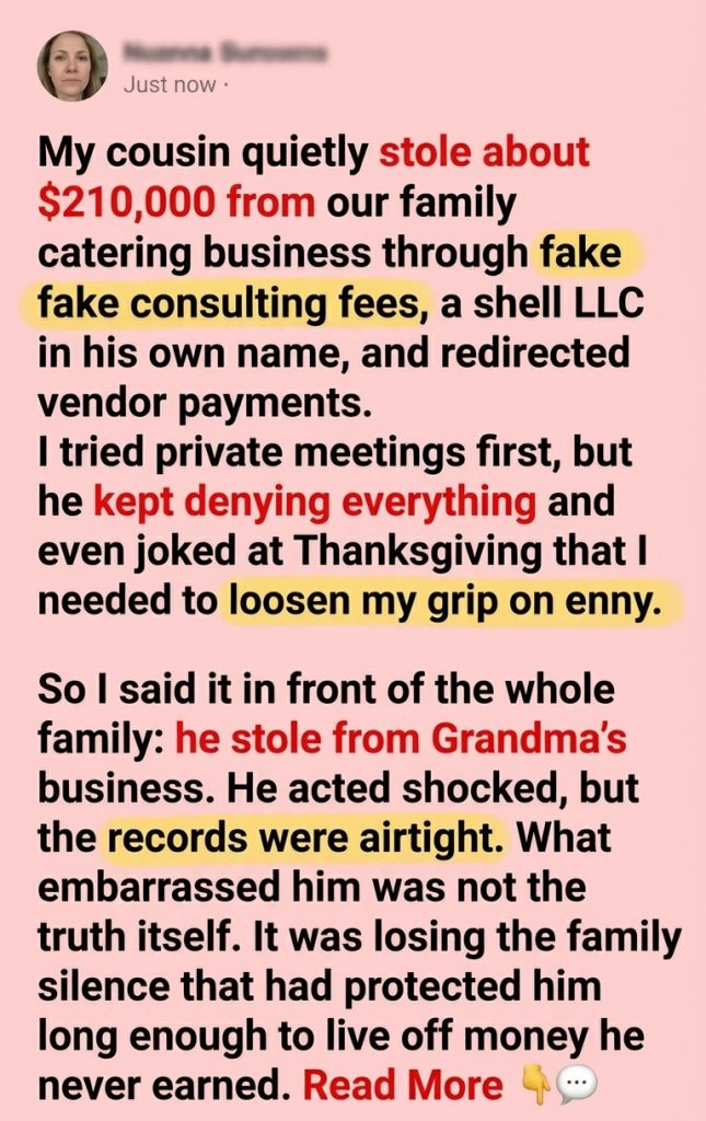 My cousin stole $210,000 from our family business and acted shocked when I exposed him at Thanksgiving. What shocked him, really, was not the accusation. It was the end of inherited protection. He thought blood would keep turning the lights down around the truth. Instead, the truth arrived between the turkey and the pie and finally made the room bright enough to see him clearly.