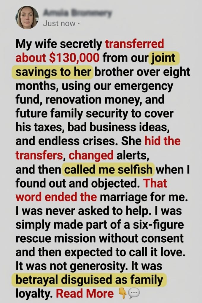 My wife secretly gave her brother $130,000 from our joint savings and called me selfish for objecting. But objection was the first sane response in a marriage that had quietly turned shared security into hidden tribute. She did not just take money. She reassigned the meaning of our work, our trust, and our future without permission, then acted wounded when I refused to worship the sacrifice she volunteered on my behalf.