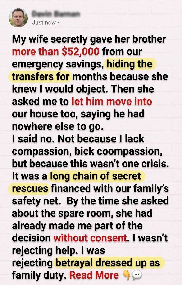 I refused to let my wife’s brother move in after she had already secretly given him our emergency savings because the issue was never only his need. It was her dishonesty, her unilateral decisions, and the way my objections were treated as cruelty instead of the very normal response of someone protecting his household.