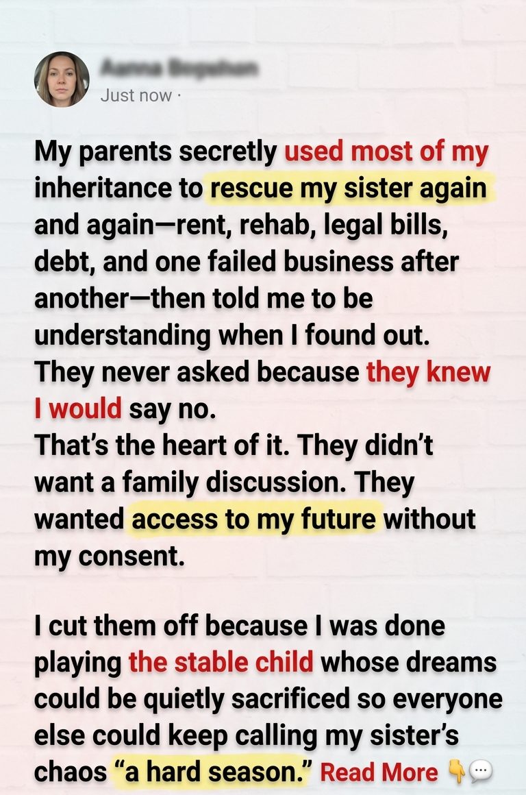Over six years, my parents had used my inheritance to cover her rent, rehab stays, legal fees, credit card settlements, a failed boutique venture, a custody dispute, and a frightening amount of “temporary stability support.” Temporary, apparently, can last for years when you’re spending someone else’s future.